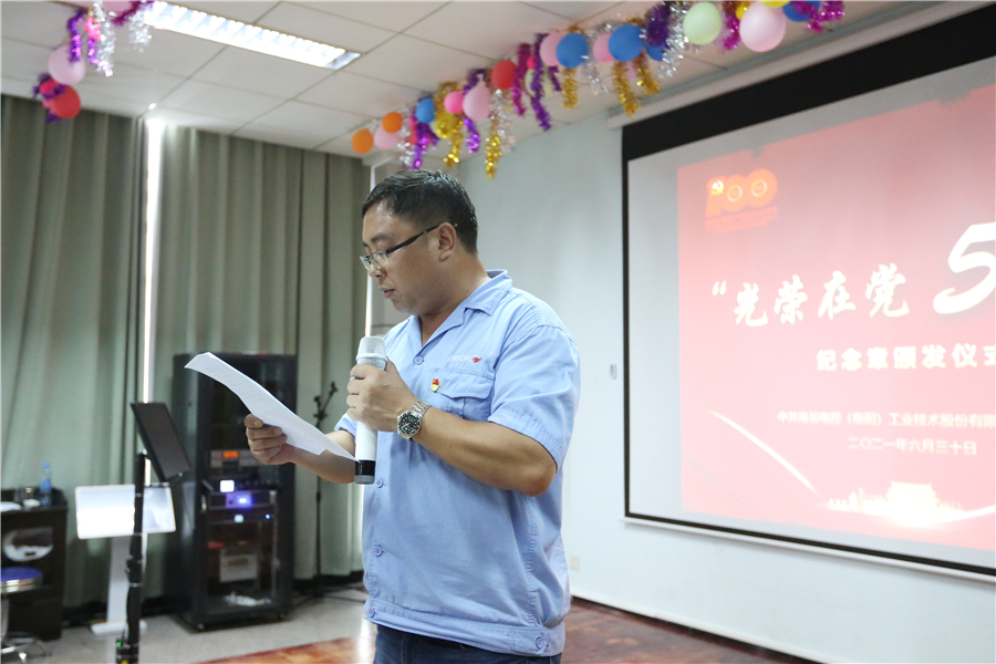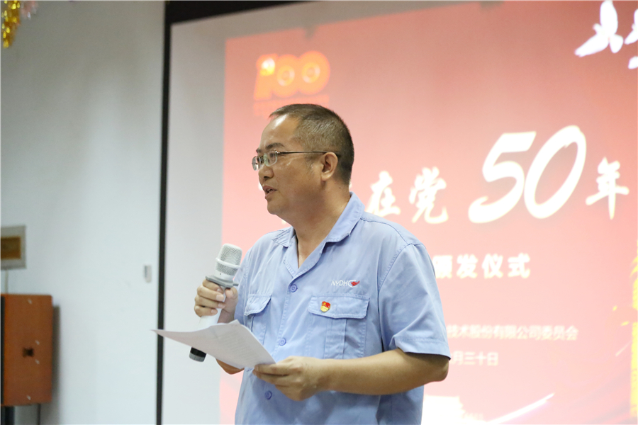 公司党委副书记、总经理谭新民代表公司党委发表了重要讲话。他首先向荣获“光荣在党50年”纪念章的老党员表示热烈的祝贺,对老党员为党和国家改革发展事业、南岳电控振兴发展做出的突出贡献,致以崇高的敬意和诚挚的问候;并宣读了公司党委书记、董事长龙美彪的贺信及致辞。他指出,为“光荣在党50年”的老党员颁发纪念章,是中国共产党成立100周年庆祝活动的重要组成部分,这是党中央首次颁发此类纪念章,颁发对象是截至2021年7月1日党龄达到50周年、一贯表现良好的党员,这充分体现了以习近平同志为核心的党中央对老党员们的高度重视和亲切关怀,体现了党和人民对全国710多万名老党员历史贡献的充分肯定。他强调,我公司荣获“光荣在党50年”纪念章的58名老党员,为南岳电控的振兴发展做出了突出贡献,他们用超过半个世纪的思想自觉、政治自觉、行动自觉,生动诠释了忠诚、担当、拼搏、奉献,用初心和使命践行了入党誓言,为接力奋斗的年轻人、后来人,树立了先进典型、凝聚了榜样力量。他要求,公司各级党组织和广大共产党员要以荣获“光荣在党50年”纪念章的老党员为学习榜样,进一步发挥战斗堡垒作用和先锋模范作用,积极做好本职工作,主动服务生产经营,奋发有为,开拓进取,攻坚克难,为促进公司转型发展、为实现公司复兴图强做出新的更大的贡献。