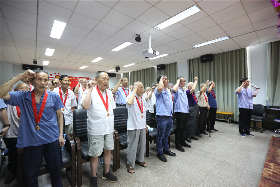 纪念章颁发仪式在雄壮的《国歌》声中拉开帷幕。公司党委委员、常务副总谭爱平代表公司党委宣读了《南岳电控“光荣在党50年”表彰通报》。之后,在庄重、热烈的气氛中,公司党委副书记、总经理谭新民,党委委员、常务副总谭爱平为老党员们逐一颁发纪念章,老党员们抚摸着胸前熠熠生辉的纪念章,倍感光荣,高兴、激动之情溢于言表。接下来,公司党委委员、副总经理邹凡丁带领荣获“光荣在党50年”纪念章的老党员,面向鲜红的党旗,举起右手,重温入党誓词,牢记初心使命,进一步坚定理想信念,再一次感受思想的洗礼与升华。
